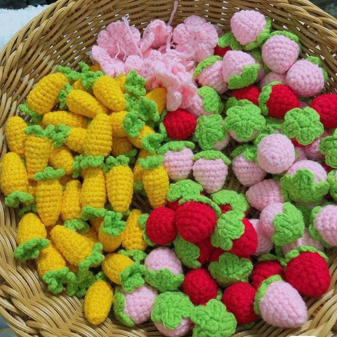 Fuente directa, accesorios de frutas de ganchillo de punto hechos a mano, fresas pequeñas, zanahorias, otras frutas para niños, decoración de mascotas